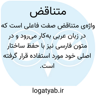 متناقض. [ م ُ ت َ ق ِ ] ( ع ص ) عهدشکننده. ( آنندراج ) ( از منتهی الارب ) ( از اقرب الموارد ). عهد و پیمان شکننده. || کسی که خراب میکند بنا را. ( ناظم الاطباء ). || آن که واز میکند تاب ریسمان را. ( ناظم الاطباء ) ( از منتهی الارب ) ( آنندراج ). و رجوع به تناقض شود. || مخالف. عکس. ناموافق و نقیض هم باشنده: ولیکن روا نباشد که قول خدای متناقض باشد. ( جامعالحکمتین، از فرهنگ فارسی معین ).