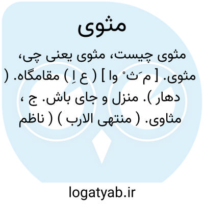 مثوی. [ م َث ْ وا ] ( ع اِ ) مقامگاه. ( دهار ). منزل و جای باش. ج، مثاوی. ( منتهی الارب ) ( ناظم الاطباء ) ( از اقرب الموارد ). جای آرام و قرارگاه. ج، مثاوی. ( آنندراج ). منزل. یقال: نزلوا مثوی مبارکاً؛ ای منزلاً. ج، مثاوی. ( محیط المحیط ). اقامت. جای. منزل. مقام: سقی اﷲ ثراه و جعل الجنة مثواه. ( یادداشت به خط مرحوم دهخدا ): سنلقی فی قلوب الذین کفروا الرعب بما اشرکوا باﷲ ما لم ینزل به سلطاناً و مأویهم النار و بئس مثوی الظالمین. ( قرآن 151/3 ). فأدخلوا ابواب جهنم خالدین فیها فلبئس مثوی المتکبرین. ( قرآن 29/16 ). برادر کامکار را از مثوی و مواسات خویش محروم واز فقدان صحبت والفت خود در هر صباح و مساء مغموم ساخت. ( ترجمه تاریخ یمینی چ 1 تهران ص 456 ).