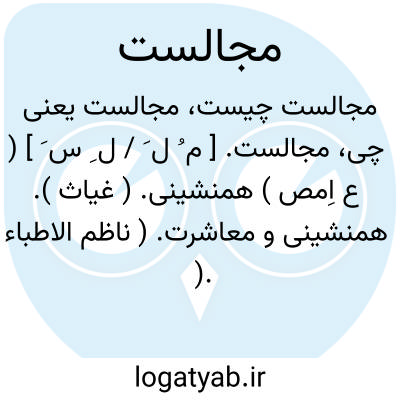 مجالست. [ م ُ ل َ / ل ِ س َ ] ( ع اِمص ) همنشینی. ( غیاث ). همنشینی و معاشرت. ( ناظم الاطباء ). نشست و برخاست. ( یادداشت به خط مرحوم دهخدا ): و من بنده را بر مجالست و دیدار و مذاکرات و گفتار ایشان الفی تازه گشته بود. ( کلیله و دمنه ). نادان را از مجالست دانا... ملال افزاید. ( کلیله و دمنه ).به مطالعه کتب و مجالست اهل ادب پرداخت. ( ترجمه تاریخ یمینی چ 1 تهران ص 337 ). به مجالست و مؤانست و منادمت خویش مخصوص گردانید. ( ترجمه تاریخ یمینی ). او را در کنف عاطفت و رحمت خویش گرفت و به مجالست و مؤانست و منادمت و منافثت خود اختصاص داد. ( ترجمه تاریخ یمینی چ شعار ص 299 ). و امروز که جواذب همتم از مجالست آحاد به منافثت اکابر کشید... نظر از خسایس مراتب امور بر عوالی نهادم. ( مرزبان نامه چ قزوینی ص 236 ). به مجالست و منافثت اهل آن بقعه که شاه رقعه هفت کشور است تزجیت ایام نامرادی می کردم. ( مرزبان نامه چ قزوینی ص 9 ). زاغ گفت جوانمردا من از سر مخالصتی تمام به مجالست تو رغبت نمودم. ( مرزبان نامه چ قزوینی ص 273 ). باری عزشانه... پادشاه دین پرور عدل گستر را... به روی خوب و... و تبرّک به مجالست ارباب ورع... ممتاز گردانیده است. ( المعجم چ دانشگاه ص 13 ). خوبرویی که درون صاحبدلان به مجالست او میل کند. ( گلستان ). فرش هوس در نوردم و گرد مجالست نگردم. ( گلستان ).