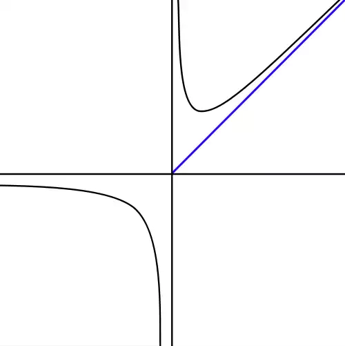 در هندسۀ تحلیلی، خط راستی که منحنیبه تدریج به آن نزدیک و نزدیک تر می شود، اما هرگز به آن نمی رسد. مثلاً محورهای x و y مجانب های نمودار xy=c (هذلولی متساوی الساقین)اند. اگر نقطه ای روی یک منحنی به خط راستی نزدیک و نزدیک تر شود و فاصله اش از آن خط d باشد، آن خط را مجانب منحنی می گویند در صورتی که وقتی نقطه به سوی بی نهایت می رود، حد d به سمت صفر میل کند. در میان مقاطع مخروطییا منحنی های حاصل از تقاطع یک صفحه با یک سطح مخروطیِ دو دامنه، هذلولی دو مجانب دارد. مجانب های هذلولی متساوی الساقین برهم عمودند.
