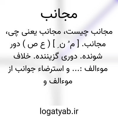 ( اسم ) ۱ - دور شونده دوری گزیننده مقابل موالف:... واسترضائ جوانب از موالف و مجانب و اقارب و اباعد... و مناصح و مخالص و مماذق تمام باتمام رسانید. ۲ - خط مستقیمی را مجانب یک منحنی می گویند که چون نقطه ای در روی منحنی حرکت کند و بسمت بی نهایت رود فواصل این نقطه ازین خط مرتب کم شود و میل بصفر کند. توضیح دو خط منحنی می توانند مجانب هم باشند بر حسب آنکه فواصل نقاط واقع بر یکی از نقاط نظیرش واقع بر دیگری بسمت صفر میل کند در صورتیکه این نقاط در روی دو منحنی بسمت بی نهایت رود.