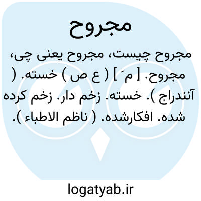 ( اسم ) زخمی شده جراحت برداشته زخمی خسته: چو روی و پشت عدوی تو زرد و مجروح است ز زخم سطوت جود تو چهر. دینار. ( مسعود سعد ) جمع: مجروحین.