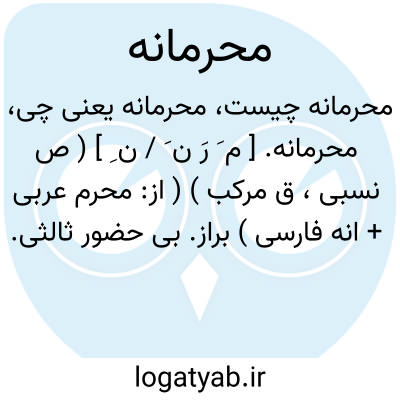 محرمانه. [ م َ رَ ن َ / ن ِ ] ( ص نسبی، ق مرکب ) ( از: محرم عربی + انه فارسی ) براز. بی حضور ثالثی. ( یادداشت به خطمرحوم دهخدا ). مخفیانه. پنهانی. پوشیده. به نهانی.