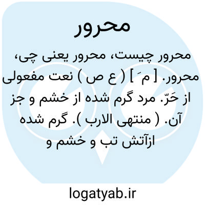 محرور. [ م َ ] ( ع ص ) نعت مفعولی از حَرّ. مرد گرم شده از خشم و جز آن. ( منتهی الارب ). گرم شده ازآتش تب و خشم و جز آن. گرم و تندخوی و خشمناک. ( از ناظم الاطباء ). || گرم مزاج. ( آنندراج ) ( ناظم الاطباء ). آنکه بر مزاج او حرارت غلبه دارد. آنکه مزاجش گرم است. آنکه مزاج حار دارد. با مزاج گرم. که طبعش گرم است. که طبع و مزاج گرم دارد. مقابل مبرود.آنکه مزاج و طبیعت گرم دارد. آنکه گرمیش کرده است. ( یادداشت مرحوم دهخدا ): و از جهت مردم محرور دانگی کافور و درم سنگی صندل... با وی بسرشند. ( ذخیره خوارزمشاهی ). اینها همه سرد باشد و مردم محروررا شاید. ( ذخیره خوارزمشاهی ). شراب مویزی... میل به خنکی دارد و موافق است محروران را. ( نوروزنامه ).