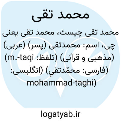 معنی: ترکیب دو اسم محمد و تقی ( ستوده و پرهیزگار )، از نام های مرکب، ا محمّد و تقی، ( اَعلام ) ) محمّد تقی اصفهانی ( = آقا نجفی ): [، قمری] مجتهد با نفوذ اصفهان، دارای کتابهای متعدد در موضوعهای دینی، ) محمّدتقی مجلسی [قرن هجری] پدر محمّدباقر مجلسی، روحانی شیعه ی ایرانی، مؤلف کتابهایی در اخبار و حدیث شیعه، از جمله: شرح تهذیب الحدیث طوسی و ترجمه مَن لایَحضَره الفقیه