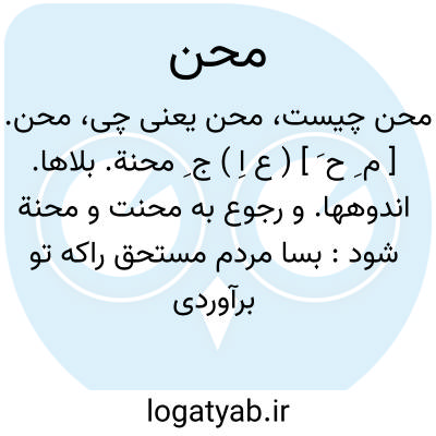 محن. [ م َ ] ( ع مص ) زدن. ( منتهی الارب ). محن فلاناً عشرین سوطاً؛ زد فلان را بیست تازیانه. ( ناظم الاطباء ). || آزمودن. ( غیاث ) ( زوزنی ) ( منتهی الارب ). || بخشیدن.محن الثوب؛ بخشید آن را. دادن. ما محننی شیئاً؛ ای ما منحنی علی القلب؛ یعنی نداد مرا چیزی. || پوشیدن و کهنه ساختن جامه را. ( منتهی الارب ). محن الثوب؛ پوشید آن جامه را تا کهنه شد. ( ناظم الاطباء ). || آرمیدن با زن. ( از منتهی الارب ). || گل و خاک چاه برآوردن و پاک کردن. ( منتهی الارب ).محن البئر؛ برآورد گل و خاک آن چاه را و پاک کرد آن را. ( ناظم الاطباء ). || نرم گردانیدن چرم را یا بر کندن پوست. ( منتهی الارب ). محن الادیم؛ نرم گردانید آن چرم را و برکند پوست آن را. ( ناظم الاطباء ).