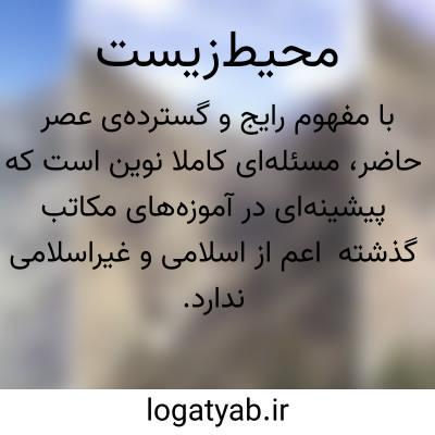 [ویکی فقه] محیط زیست عصر حاضر، بحثی کاملاً تازه است که در هیچ مکتب دیگری سابقه نداشته است؛ اما می‏توان قواعد و مقررات مورد نیاز آن را از متون دینی استخراج کرد.