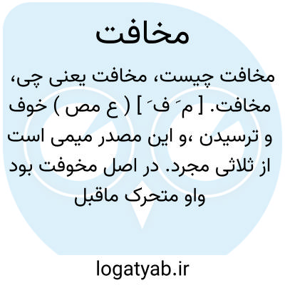 مخافت. [ م َ ف َ ] ( ع مص ) خوف و ترسیدن،و این مصدر میمی است از ثلاثی مجرد. در اصل مخوفت بود واو متحرک ماقبل آن حرف صحیح ساکن، حرکت واو نقل کرده به ماقبل دادند واو در اصل متحرک بود، ماقبل آن اکنون مفتوح گردید آن واو را به الف بدل کردند مخافت شد. ( غیاث ) ( آنندراج ): و هر که علم بداندو بدان کار نکند به منزلت کسی باشد که مخافت راهی را می شناسد اما ارتکاب کند تا به قطع و غارت مبتلا گردد. ( کلیله و دمنه چ مینوی ص 40 ). پس من دنیا را بدان چاه پرآفت و مخافت مانند کردم. ( کلیله و دمنه ایضاً ص 57 ). حالی ذات او از مشقت فاقه و مخافت بوار مسلم ماند. ( کلیله و دمنه ایضاً ص 108 ). و مرا به مهمانی دعوت کرد و من متردد که گوئیا ضیافتی است یا آفتی و مخافتی. ( ترجمه تاریخ یمینی چ 1 طهران ص 96 ). پدر اگر در غیبت من وصایتی کرده است سبب بعد مسافت و قرب آفت و مخافت تفرق جمع و تشتت حال بود. ( ترجمه تاریخ یمینی ایضاً ص 189 ). گفتم حکایت آن روباه مناسب حال تست که دیدندش گریزان و بی خویشتن افتان و خیزان، کسی گفتش چه آفت است که موجب چندین مخافت است. ( گلستان ).