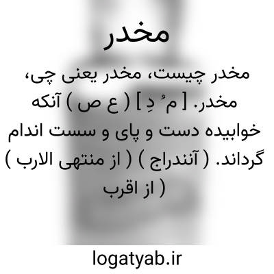مخدر. [ م ُ دِ ] ( ع ص ) آنکه خوابیده دست و پای و سست اندام گرداند. ( آنندراج ) ( از منتهی الارب ) ( از اقرب الموارد ). کسی یا چیزی که سست و بی حرکت می کند و موجب خواب رفتگی اعضاء می شود. ( ناظم الاطباء ). || درآمده در روز باران. ( ناظم الاطباء ) ( از منتهی الارب ) ( از اقرب الموارد ). || مقیم و آرام در خانه و یا در لانه. ( ناظم الاطباء ) ( از منتهی الارب ) ( از اقرب الموارد ). و رجوع به اخدار شود.
