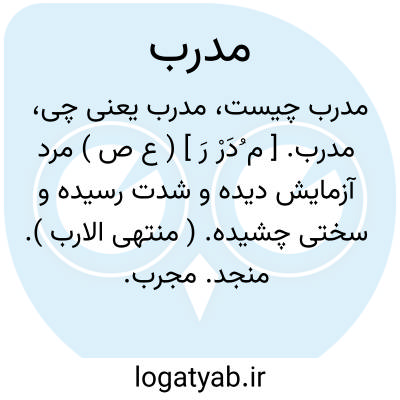 مدرب. [ م ُ دَرْ رِ ] ( ع ص ) شکیبائی نماینده در کارزار وقت شدت و فرار. ( آنندراج ) ( از اقرب الموارد ). نعت فاعلی است از تدریب. رجوع به تدریب شود. || کسی که درمی آید در زمین دشمنان از بلاد روم. ( ناظم الاطباء ): ادرب القوم؛ دخلوا ارض العدو من بلاد الروم. ( اقرب الموارد ). || رجل مدرب؛ مرد مجرب. آزماینده. ( ناظم الاطباء ).