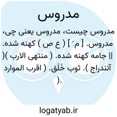 ( اسم و صفت ) ۱- کهنه کهن. ۲- جام. کهنه. ۳- بی رونق فرسوده: و میگویند قریب سی سال بود تا ایشان در دست دیلمان اسیر بودند و رسوم اسلام مدروس... ۴ - ناپدید شده: مباد نام تو از دفتر بقا مدروس مباد عمر تو از علت فنا معتل. ( مسعود سعد ) ۵ - دیوانه.