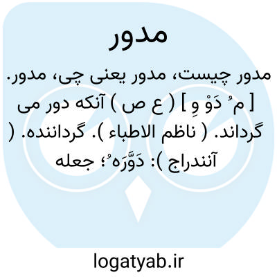 مدور. [ م ُ دَوْ وِ ] ( ع ص ) آنکه دور می گرداند. ( ناظم الاطباء ). گرداننده. ( آنندراج ): دَوَّرَه ُ؛ جعله یدور. ( متن اللغة ). رجوع به تدویر شود. || گرد و مدور گرداننده چیزی. ( آنندراج ). نعت فاعلی است از تدویر به معنی گرد و دایره کردن چیزی را. رجوع به تدویر شود.