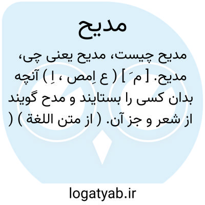 مدیح. [ م َ ] ( ع اِمص، اِ ) آنچه بدان کسی را بستایند و مدح گویند از شعر و جز آن. ( از متن اللغة ) ( از اقرب الموارد ). مدح. مدحت. ستایش. آفرین. مدیحه. سخنی - و غالباً شعری - که در توصیف و تحسین و تمجید ممدوحی گویند یا نویسند. ج، مدایح: