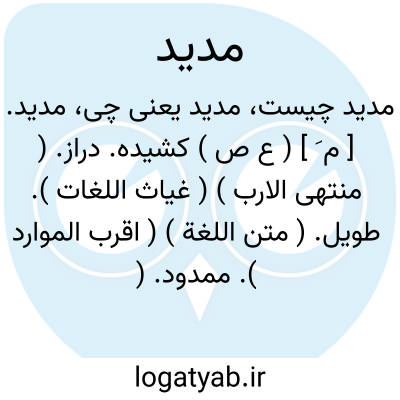 مدید. [ م َ ] ( ع ص ) کشیده. دراز. ( منتهی الارب ) ( غیاث اللغات ). طویل. ( متن اللغة ) ( اقرب الموارد ). ممدود. ( اقرب الموارد ). درازبالا. ( دستور الاخوان ). گویند: مدیدالقامة، مدیدالجسم، مدیدالعنق. ( از متن اللغة ). ج، مُدُد: