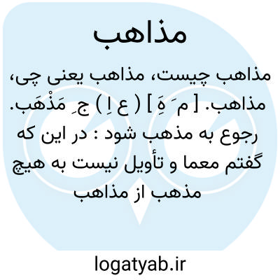 ( اسم ) جمع مذهب ۱- طریقه ها روشها. ۲ - شعبه های دینی: در آنجا ازاغلب مذاهب مردم بودند. ۳- دینها ادیان.