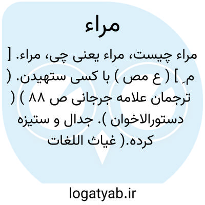 مراء. [ م ِ ] ( ع مص ) با کسی ستهیدن. ( ترجمان علامه جرجانی ص 88 ) ( دستورالاخوان ). جدال و ستیزه کرده.( غیاث اللغات ). پیکار نمودن با کسی. جدال کردن. ( آنندراج ) ( از منتهی الارب ). مجادله کردن و پا فشردن. ( از متن اللغة ). مجادله کردن. منازعه کردن. لجاج ورزیدن و طعنه زدن در سخن کسی به قصد تزییف سخن او یا تحقیر گوینده. مماراة. ( از اقرب الموارد ). جدال. مرا. || شک کردن. شک. ( یادداشت مؤلف ). مراء اعتراضی است بر سبیل شک و ریبت. ( از متن اللغة ). رجوع به معنی قبلی شود. || گوارا شدن طعام. ( صراح ). مرء. رجوع به مرء شود. || ( اِ ) ج ِ مِرآة است. رجوع به مرآة شود. || ( اِمص ) خودنمائی. ( غیاث اللغات ). رجوع به مرا و مرا کردن شود.