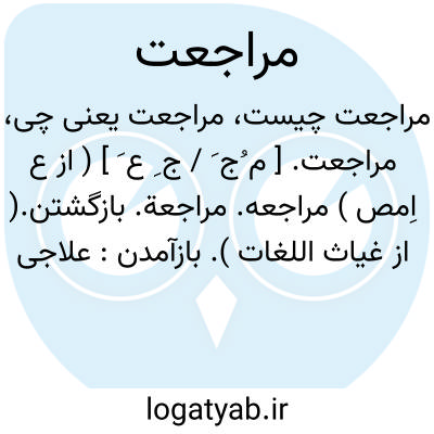 ( مصدر ) مراجعه باز گشتن بازگشت: در تهنیت مراجعت سلطان سنجر از بغداد به نشابور. توضیح در تداول فارسی مراجعت بمعنی بازگشتن و بازگشت و مراجعه بمعنی رجوع کردن استعمال شود.