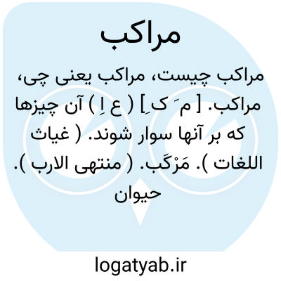 مراکب. [ م َ ک ِ] ( ع اِ ) آن چیزها که بر آنها سوار شوند. ( غیاث اللغات ). مَرْکَب. ( منتهی الارب ). حیوان یا وسائلی که بر آنها سوار شوند و طی طریق کنند، اعم از اسب یا کشتی.رجوع به مرکب شود: بفرموده تا به وجه اعظام و احترام با ساز و عدت و آلت و اهبت و مراکب و موالی با سرخانه و اهالی گردد. ( مرزبان نامه، از فرهنگ فارسی معین ). بفرمود تا جواری و منشآت و مراکب و سفاین را ترتیب سازد. ( بدایع الازمان فی وقایع کرمان ).