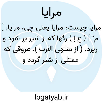 مرایا. [ م َ ] ( ع اِ ) رگها که از شیر پر شود و ریزد. ( از منتهی الارب ). عروقی که ممتلی از شیر گردد و از آنها شیر بیرون تراود. ( از بحر الجواهر ). || ج ِ مرآت و مرآة، به معنی آینه است. ( از منتهی الارب ) ( از مهذب الاسماء ). رجوع به مرآة شود. || ج ِ مَری است. ( از ناظم الاطباء ). رجوع به مری شود. || ج ِ مَرآی است. ( از ناظم الاطباء ). ( از فرهنگ فارسی معین ). مناظر. دیدارها. منظره ها. رجوع به مَرئی ̍ و مَرآی شود.