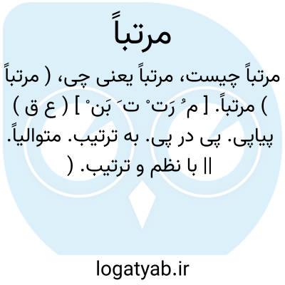 ( مرتباً ) مرتباً. [ م ُ رَت ْ ت َ بَن ْ ] ( ع ق ) پیاپی. پی در پی. به ترتیب. متوالیاً. || با نظم و ترتیب. ( از فرهنگ فارسی معین ).