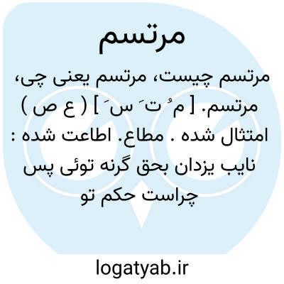 مرتسم. [ م ُ ت َ س ِ ] ( ع ص ) فرمان برنده. ( آنندراج ). مطیع و فرمانبردار هر قاعده و قانونی. ( ناظم الاطباء ). امتثال کننده. اطاعت کننده. نعت فاعلی است از ارتسام به معنی امتثال. || گوینده کلمه تکبیر و اﷲ اکبر. ( ناظم الاطباء ). تکبیر گوینده و تعویذ و دعا خواننده. رجوع به ارتسام شود. || نقش گیرنده. ( غیاث اللغات ) ( آنندراج ). نقش پذیر. رجوع به ارتسام شود. || منقوش. ( فرهنگ فارسی معین ). رجوع به مرتسَم شود. || متدین و دین دار. رجوع به معنی دوم این واژه شود. || با عزت و بزرگوار و مغرور و متکبر. ( ناظم الاطباء ).
