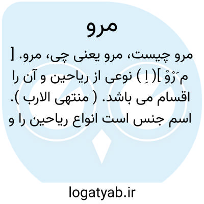 مرو. [ م َرْوْ ]( اِ ) نوعی از ریاحین و آن را اقسام می باشد. ( منتهی الارب ). اسم جنس است انواع ریاحین را و بطور مطلق «مرماحوز» ( مرماخوز ) است، یک دانه آن مروة باشد. نوعی از ریاحین. ( دهار ) ( از اقرب الموارد ). گیاهی باشد خوشبو که آن را مروخوش نیز خوانند و عربان ریحان الشیوخ و حبق الشیوخ خوانند. ( از جهانگیری ) ( از برهان ). خودروی وی کم بود و هیئت برگ او آن است که دراز بود و اطراف او تیز باشد و نبات او درشت بود و بوی او به بوی تیسوم مشابه بود و گل او کبود بود و آنچه مزروع بود گل او را کبودی از دشتی کمتر باشد و او را مروماحور گویند، تخم این هر دو نوع از شهدانه خردتر بود و یک جانب او پهن باشد. ( از تذکره ضریر انطاکی ). اسم جنس است ریاحین را و انواع او هریک بنامی مخصوص، و برابرون و خزامی و اقحوان و لسان الثور نیز اطلاق میکنند، و از مطلق او مراد نوع خوشبوی او است که مرماحوز باشد. و اصناف مرو چهار است و نزد بعضی پنج. ( از مخزن الادویه ). کنیچه. ( بحر الجواهر ). جنسی از حی العالم. ( مفاتیح ). تب بر. توفیل.( منتهی الارب ). سپرم دشتی. اسم جنس است انواع ریاحین را و چون مطلق گویند مراد مرماحوز است، اعشی گوید: و آس و خیری ة و مرو و سوسن ِ. ( از اقرب الموارد ).