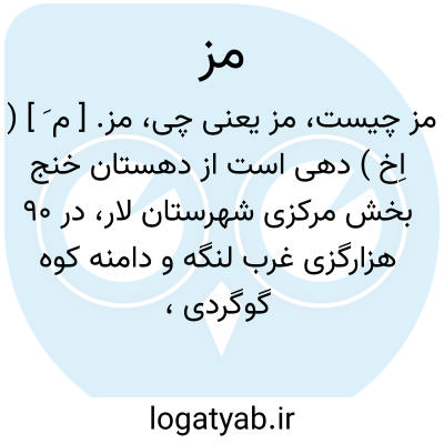 مز. [ م َ ] ( اِخ ) دهی است از دهستان خنج بخش مرکزی شهرستان لار، در 90 هزارگزی غرب لنگه و دامنه کوه گوگردی، درمنطقه گرمسیر واقع و دارای 298 تن سکنه است. آبش از قنات و چاه محصولش غلات و پنبه، شغل مردمش زراعت است. ( از فرهنگ جغرافیایی ایران ج 7 ).