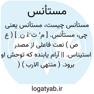 مستأنس. [ م ُ ت َءْ ن ِ ] ( ع ص ) نعت فاعلی از مصدر استیناس. || آرام یابنده که توحش او برود. ( منتهی الارب ) ( اقرب الموارد ). مأنوس. الفت گیرنده و خوگر. ( غیاث ) ( آنندراج ). خوگیر: چون خلاص یافت بدان حالت مستأنس گردد و نفرت او از آن صورت نقصان پذیرد. ( ترجمه تاریخ یمینی ص 180 ). مصنف ترجمه ابوالشرف بوقتی که از وطن منزعج بود و به اصفهان مقیم مدتها به ریاض آن فواید آن تفسیر مستأنس بود. ( ترجمه تاریخ یمینی ص 253 ). و رجوع به استئناس و استیناس شود. || دستوری خواهنده. ( منتهی الارب ) ( اقرب الموارد ). || نیک نگرنده و شناسنده. ( منتهی الارب ) ( اقرب الموارد ).