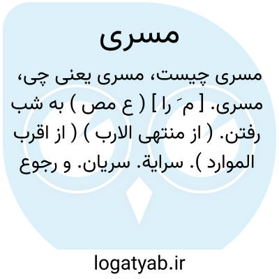 مسری. [ م َ را ] ( ع مص ) به شب رفتن. ( از منتهی الارب ) ( از اقرب الموارد ). سرایة. سریان. و رجوع به سرایة و سریان شود. || ( اِ ) راه. ج، مَساری. ( یادداشت مرحوم دهخدا ).