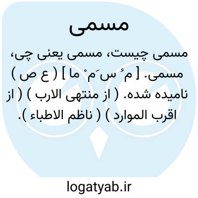 مسمی. [ م ُ س َم ْ ما ] ( ع ص ) نامیده شده. ( از منتهی الارب ) ( از اقرب الموارد ) ( ناظم الاطباء ). به نامی خوانده شده. ( از منتهی الارب ) ( از اقرب الموارد ). خوانده شده. ( ناظم الاطباء ). نام کرده شده، یعنی صاحب نام. ( آنندراج ) ( غیاث ). نام نهاده شده. ( از منتهی الارب ) ( از اقرب الموارد ). ملقب شده. ( ناظم الاطباء ). نام کرده. ( دهار ). مسمّا. موسوم. نامیده. نامزد. نامزدشده. ( ناظم الاطباء ). مُترجَم. ( یادداشت مرحوم دهخدا ). و رجوع به مسمّا شود: