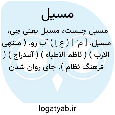 مسیل. [ م َ ] ( ع اِ ) آب رو. ( منتهی الارب ) ( ناظم الاطباء ) ( آنندراج ) ( فرهنگ نظام ). جای روان شدن آب. ( غیاث ). جای رفتن آب. ( از فرهنگ نظام ). راه گذر آب هر جا که باشد. ( مهذب الاسماء ) ( دهار ). گذرگاه آب. آب کند. راه گذر آب به نشیب. راه گذر هین. رهگذر آب. ( زمخشری ). محل جریان سیل. ( از اقرب الموارد ) ( ناظم الاطباء ). هر جای سیل گیر که سیلاب در آن بگذرد و عبور سیل از آن ممکن باشد. ( ناظم الاطباء ). معبر سیل. دره. دره ای که سیل در آن رود. راه گذر سیل. سیل گاه. مسیلة. بستر سیل. ج، مَسائل، مُسُل، أمسِلة، مُسلان. ( از اقرب الموارد ) ( ناظم الاطباء ) ( مهذب الاسماء ):