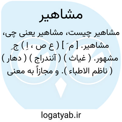 مشاهیر. [ م َ ] ( ع ص، اِ ) ج ِ مشهور. ( غیاث ) ( آنندراج ) ( دهار ) ( ناظم الاطباء ). و مجازاً به معنی بزرگان و ناموران. ( غیاث ) ( آنندراج ). مردمان مشهور و معروف و شناسا. ( ناظم الاطباء ): چنین نبشته است بوریحان در مشاهیر خوارزم. ( تاریخ بیهقی چ ادیب ص 681 ). و طایفه ای از مشاهیر ایشان... به منزلت ساکنان خانه و بطانه مجلس بودند. ( کلیله و دمنه ). و از حال بزرگان رای و مشاهیر شهر و... ( کلیله و دمنه ). وزیر ابوالعباس از معارف کتاب و مشاهیر اصحاب فایق بود. ( ترجمه تاریخ یمینی چ 1 تهران ص 456 ). صنادید قروم و مشاهیر ملوک به عجز از وی روی برتافته. ( ترجمه تاریخ یمینی ص 410 ). و معارف کبار و مشاهیر احرار را بر لزوم طاعت و قیام به خدمت او تکلیف فرمود. ( ترجمه تاریخ یمینی ص 438 ).
