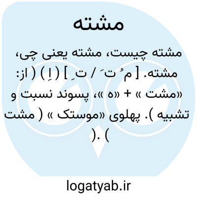 مشته. [ م ُ ت َ / ت ِ ] ( اِ ) ( از: «مشت » + «ه »، پسوند نسبت و تشبیه ). پهلوی «موستک » ( مشت ). ( حاشیه برهان چ معین ). دسته هر چیز را گویند عموماً همچو دسته کارد و خنجر و تیشه و امثال آن. ( برهان ). دسته کارد و شمشیر و خنجر. ( آنندراج ) ( انجمن آرا ). دسته هر چیز عموماً. ( فرهنگ رشیدی ). دسته هر چیز را گویند مثل دسته کارد و خنجرو امثال آن. ( جهانگیری ). دسته هر چیزی مانند کارد و خنجر و تیشه و جز آن. ( ناظم الاطباء ). || آلتی باشد از برنج و فولاد که استادان کفشدوز چرم رابدان کوبند. ( برهان ) ( از ناظم الاطباء ):
