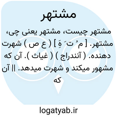 مشتهر. [ م ُ ت َ هََ ] ( ع ص ) شهرت داده شده. ( غیاث ) ( آنندراج ). مشهورکرده شده. مشهور و معروف. ( ناظم الاطباء ). شهرت یافته: