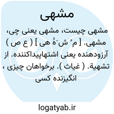 مشهی. [ م ُ ش َهَْ هی ] ( ع ص ) آرزودهنده یعنی اشتهاپیداکننده. از تشهیة. ( غیاث ). برخواهان چیزی، انگیزنده کسی را. ( آنندراج ). برانگیزاننده آرزوی نفس. ( ناظم الاطباء ). آرزوآور. آرزوکش. اشتهاآور. شهوت انگیز. خواهش انگیز. ( یادداشت مؤلف ).