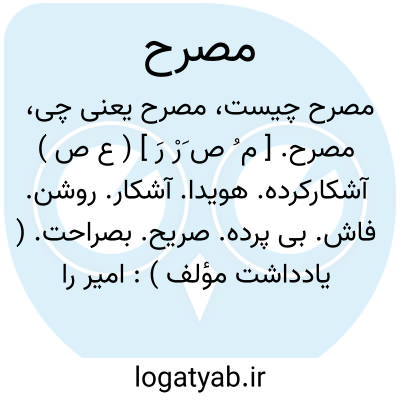 مصرح. [ م ُ ص َرْ رَ ] ( ع ص ) آشکارکرده. هویدا. آشکار. روشن. فاش. بی پرده. صریح. بصراحت. ( یادداشت مؤلف ): امیر را آگاه کردند و مصرح بگفتند که کار از دست می شود حرکت باید کرد. ( تاریخ بیهقی چ ادیب ص 625 ). از خویشتن نامه نویس و مصرح بازنمای که ازبرای وزارت تا وی را داده آید خوانده شده است.( تاریخ بیهقی چ ادیب ص 374 ). رسولان را باز باید گردانید و مصرح بگفت که میان ما و شما شمشیر است و لشکرها ازبرای جنگ فرستاده شده است. ( تاریخ بیهقی چ ادیب ص 514 ). مصرح بگفته بود که خون داماد را طلب باید کردو آن ولایت را بخواهد گرفت. ( تاریخ بیهقی چ ادیب ص 691 ). مصرح بگفتیم که مر ما را چندان ولایت در پیش است... می باید گرفت. ( تاریخ بیهقی چ ادیب ص 73 ). اما شرایط نیت در تیمم در نزد ابوحنیفه به این دلیل است که قصد داخل در ماهیت تیمم می باشد زیرا در کلمه فتیممواوجوب قصد و نیت مصرح است. ( معارف بهاء ولد ص 332 ).