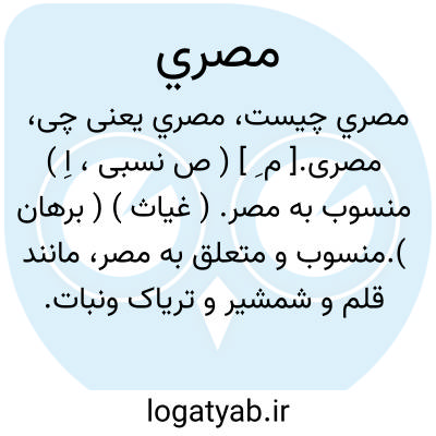 ۱- ( صفت ) منسوب به مصر: ۲ - از مردم مصر اهل مصر جمع: مصریان. یا شمشیر مصری. نوعی شمشیر که در مصر ساخته میشد: آلت او شمشیر است و آن چهارده گونهاست: یکی یمانی دوم هندی... یازدهم مصری. ۳ - ( اسم ) نبات ( خوردنی ) منسوب به مصر. ۴ - شمشیر. ۵ - قلم. ۶ - تریاک.