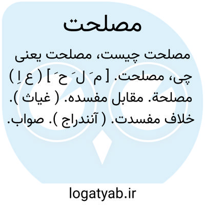 ( اسم ) ۱ - آنچه که صلاح و سود شخص یا گروهی در آن باشد: چون بعد مسافرت بقرب مبدل شد باید که مقدم و سرور شما عزیمت حضرت مصمم کند تا آنچه مصلحت ومقتضی وقت باشد استماع کرده باخلع پادشاهانه مراجعت نماید. ۲ - خیر اندیشی: شیر بعد از تامل بسیار فرمود که این سخن عین مصلحت و هواخواهی است... ۳- کارنیک. ۴ - آنچه که صلاح شخصی باشد در حالی که بضرر اشخاص دیگر و جامعه تمام شود. چون میان او و اسکندر مخالفت و دشمنی بود بر حسب قضی. الحرب خدعه او را بگرفتند و پیش اسکندر فرستادند و بزبان مصلحت و فریب پیغام دادند که دشمن ترا فرستادیم اندیشه بخود راه مده و بی توقف بیا.