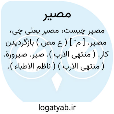 مصیر. [ م َ ] ( ع اِ ) بازگشت گاه. ( دهار ). مآب. مرجع. برگشتگاه. بازگشتگاه. بازگشت جای. ( یادداشت مؤلف ). جای بازگشت آب، یا عام است. ( منتهی الارب ). جای بازگشتن. ( آنندراج ) ( مهذب الاسماء ) ( غیاث ). || ( اِمص ) بازگشت. ( ناظم الاطباء ). بازگشت کار. صیور. ( یادداشت مؤلف ):