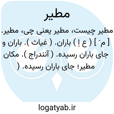 مطیر. [ م َ ] ( ع اِ ) باران. ( غیاث ). باران و جای باران رسیده. ( آنندراج ). مکان مطیر؛ جای باران رسیده. ( منتهی الارب ). ممطور و یقال یوم ماطر و مطیر و ممطور؛ یعنی روزی که در آن باران باشد. ( از اقرب الموارد ). بارانی.باران دار. بارنده. ( یادداشت به خط مرحوم دهخدا ).