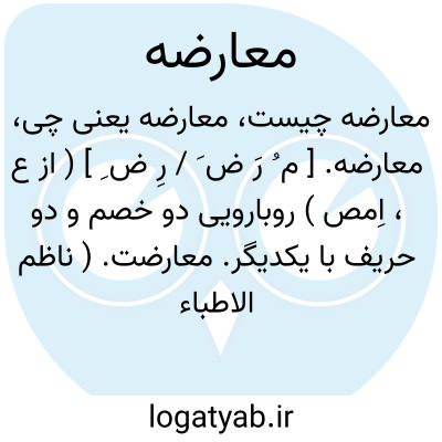 ۱ - ( مصدر ) مقابله کردن دو خصم و دو حریف با یکدیگر. ۲ - ستیزه کردن. ۳ - شکستن کلام کسی.۴- ( اسم ) مقابل. دو خصم و دو حریف با یکدیگر روبارویی: و چون حصاریان آگاهی یافتند دوان بشتافتند و بمنع و معارضه مشغول گشتند. جمع: معارضین. یا معارضه بمثل ( کردن ). انجام دادن عملی که طرف مقابل و مدعی شخص انجام داده.