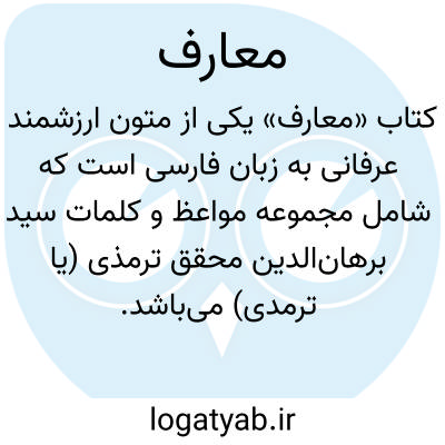 [ویکی فقه] معارف (ترمذی). «معارف»، به زبان فارسی، مجموعه مواعظ و کلمات سید برهان الدین محقق ترمدی (ترمذی)، همراه با دو تفسیر کوتاه از سوره های محمد صلی الله علیه و آله وسلّم و فتح (که مرحوم فروزان فر احتمال داده به قلم جناب ترمدی است)، از جمله آثار ارزشمند عرفانی است.