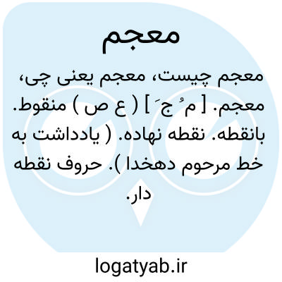 معجم. [ م ُ ج َ ] ( ع ص ) منقوط. بانقطه. نقطه نهاده. ( یادداشت به خط مرحوم دهخدا ). حروف نقطه دار. وصاحب دقایق الانشاء نوشته که معجم حروف منقوطه را از آن جهت نامند که اعجام در لغت به معنی ازاله اشتباه است چون به نقطه رفع اشتباه می شود لهذا حروف منقوطه را معجمه گویند. بعضی جمیع حروف تهجی را معجم می خوانند چرا که چنانکه به نقطه دفع اشتباه می شود به عدم نقطه نیز ازاله اشتباه می گردد. ( غیاث ):
