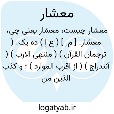 معشار. [ م ِ ] ( ع اِ ) ده یک. ( ترجمان القرآن ) ( منتهی الارب ) ( آنندراج ) ( از اقرب الموارد ): و کذب الذین من قبلهم و مابلغوا معشار ما آتیناهم فکذبوا رسلی فکیف کان نکیر. ( قرآن 45/34 ). || گویند معشار ده یک عشیر و عشیر ده یک عشر است و بنابراین معشار هزاریک می شود. ( از اقرب الموارد ) ( از ناظم الاطباء ). || ( مص ) ده یک گرفتن. ( غیاث ) ( آنندراج ). || ( ص ) ناقة معشار؛ شتر ماده ای که شیرش کم شده باشد. ( منتهی الارب ) ( ناظم الاطباء ) ( آنندراج ).
