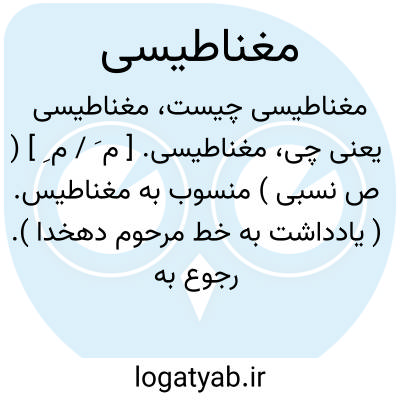 مغناطیسی. [ م َ / م ِ ] ( ص نسبی ) منسوب به مغناطیس. ( یادداشت به خط مرحوم دهخدا ). رجوع به مغناطیس شود.