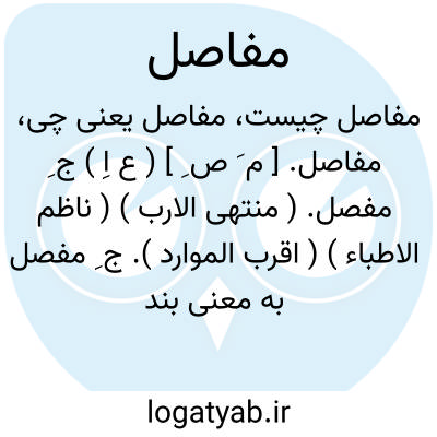 مفاصل. [ م َ ص ِ ] ( ع اِ ) ج ِ مفصل. ( منتهی الارب ) ( ناظم الاطباء ) ( اقرب الموارد ). ج ِ مفصل به معنی بند اندام و هر جای پیوستگی دو استخوان. ( آنندراج ). پیوندگاههای اندام. ( غیاث ) ( ناظم الاطباء ). بندها.پیوندها. ( یادداشت به خط مرحوم دهخدا ):