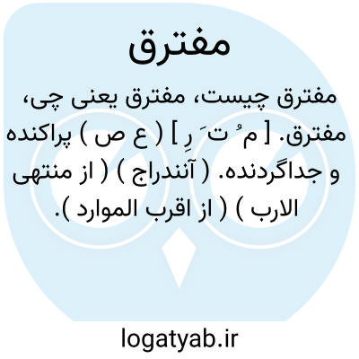 مفترق. [ م ُ ت َ رِ ] ( ع ص ) پراکنده و جداگردنده. ( آنندراج ) ( از منتهی الارب ) ( از اقرب الموارد ). پراکنده و جداگردیده. ( ناظم الاطباء ):