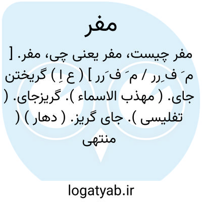 مفر. [ م َ ف ِرر / م َ ف َرر ] ( ع اِ ) گریختن جای. ( مهذب الاسماء ). گریزجای. ( تفلیسی ). جای گریز. ( دهار ) ( منتهی الارب ) ( آنندراج ) ( ناظم الاطباء ). اسم ظرف است از فرار به معنی جای گریختن، یعنی جایی که در آن گریخته نشیند و از آفت امن یابد. ( غیاث ). گریزگاه. مهرب. محیص. محید. ( یادداشت به خط مرحوم دهخدا ):