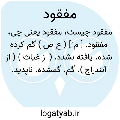 مفقود. [ م َ] ( ع ص ) گم کرده شده. یافته نشده. ( از غیاث ) ( از آنندراج ). گم. گمشده. ناپدید. غایب. معدوم. ( از ناظم الاطباء ). از دست بشده. گم شده. ناپیدا. ( یادداشت به خط مرحوم دهخدا ). || نایاب. ناپیدا: