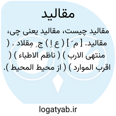 ( اسم ) الف - جمع مقلاد مفتاحها کلید ها. ب - جمع مقلد مفتاحها کلید ها [ اگر چه او مقاود تقلید بر سر قومی کشیدست و مقالید حکم ایشان در آستین گرفته... ما را بمیدان محاربت بیرون باید شدن...] ( مرزبان نامه. تهران. ۱۳۱۷ص ۸۴ )
